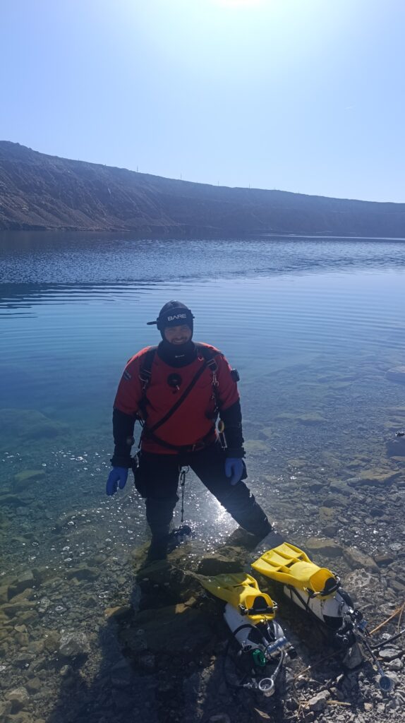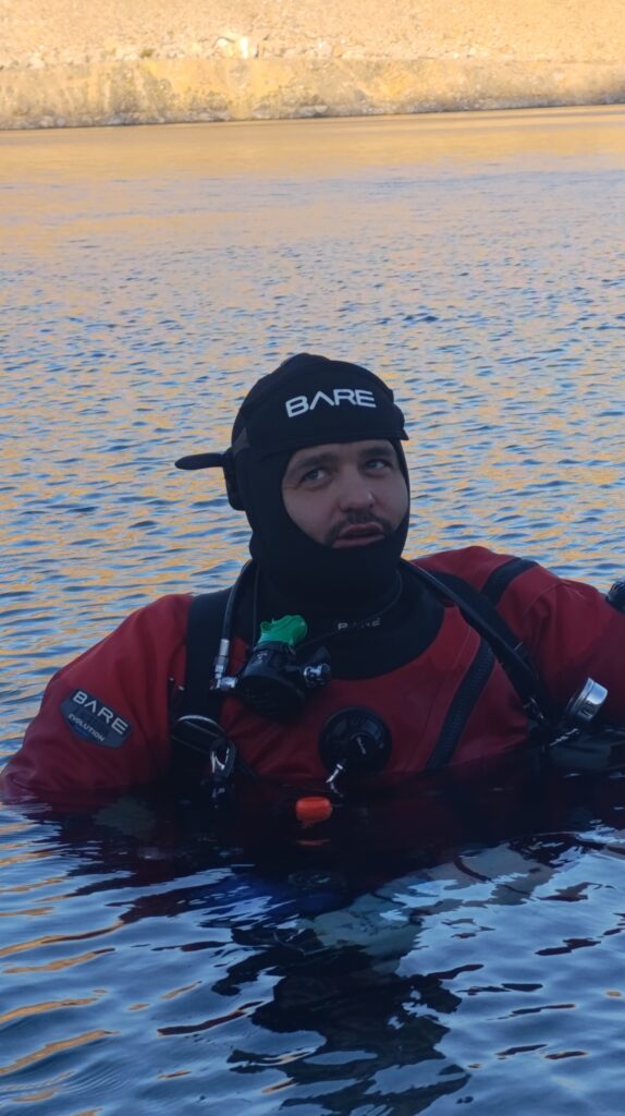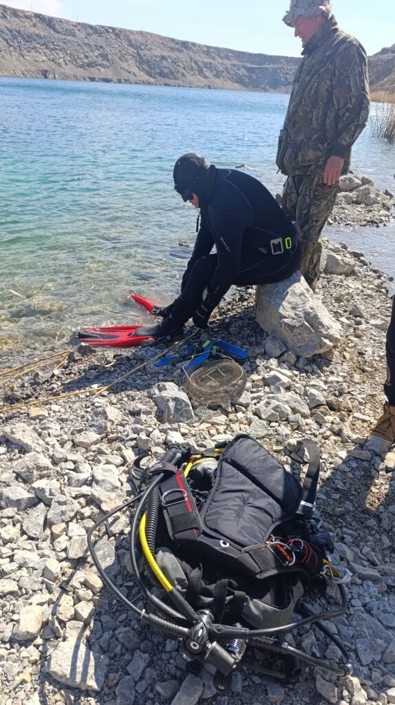 Температура тоже дала о себе знать. Летом карьеры хорошо прогреваются, и, по словам местных, на поверхности может быть до 24°C. Сейчас же на поверхности около 6–8°C, а на глубине 40 метров — около 3°C. Нырять, мягко говоря, бодрит.
