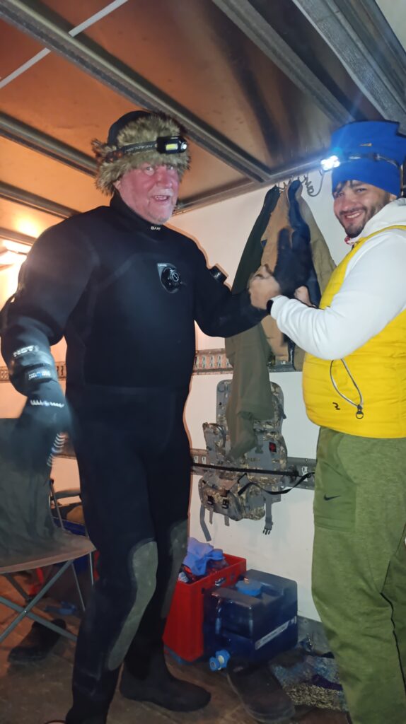 Один раз сходили всей группой на 40 метров — посмотреть условия на глубине. Вода там была около 3°C, что примерно на 1.5 градуса холоднее, чем осенью.